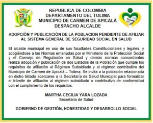 Alcaldía de Carmen de Apicalá, junto con la Secretaría de Salud Municipal