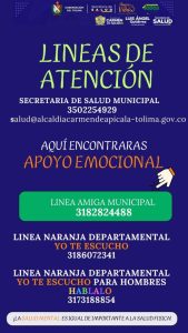 LÍNEAS DE ATENCIÓN SECRETARÍA DE SALUD MUNICIPAL 3502254929 salud@alcaldiacarmendeapicala-tolima.gov.co Aquí encontrarás apoyo