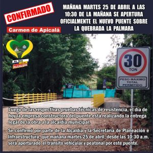 SE ENTREGÓ Y DIO AL SERVICIO EL NUEVO PUENTE SOBRE LA QUEBRADA LA PALMARA