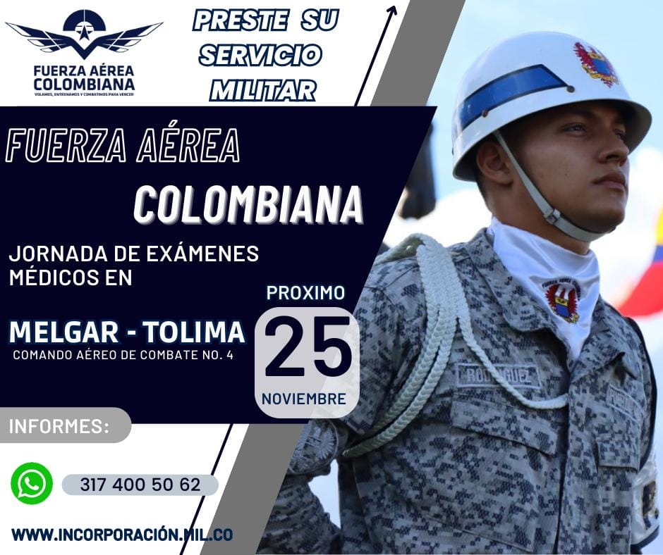 Próximas jornadas de exámenes médicos gratuitos: 25 de noviembre de 2023 en el Distrito Militar Aéreo No.4 Kilómetro 1 Via Melgar Tolima – Bogotá.